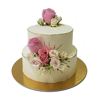Нежный свадебный торт с украшением из взбитых сливок, мастики и живых цветов